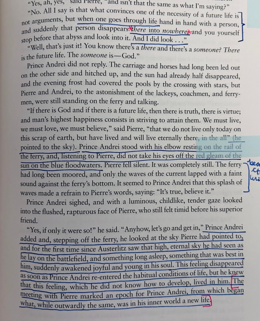 Often, what gives me pause are subtle changes Tolstoy makes with punctuation (brackets, parentheses, italics, etc.) or form (changing from events of fictional characters to more essays about historical events). Here are the passages from Volume II that rewired my brain.