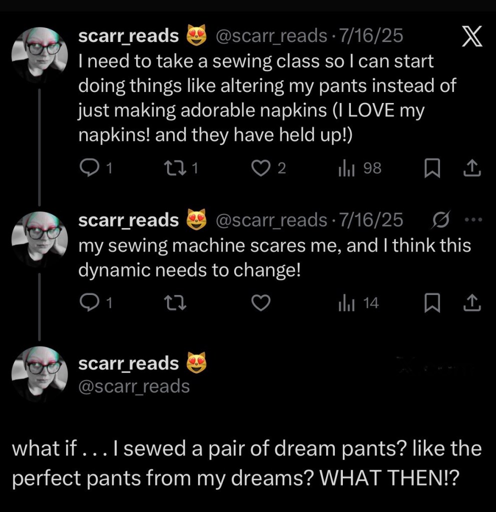 ↩︎ - I have learned how to sew shirts, a dress, pants! I ordered a bolt of fabric and 2026 will see me wearing the perfect pants of my dreams! ↩︎